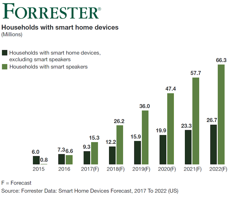 A new Forrester smart speaker forecast predicts 66.3 million US households will have a device by 2022. The report also estimates that 26.7 million households will own smart home devices other than smart speakers. The numbers suggest a US household penetration of 51% and 21% for smart speakers and smart home device users respectively. Given multiple people share households, the forecast suggests a smart speaker consumer reach of 172.4 million US consumers in 2022.